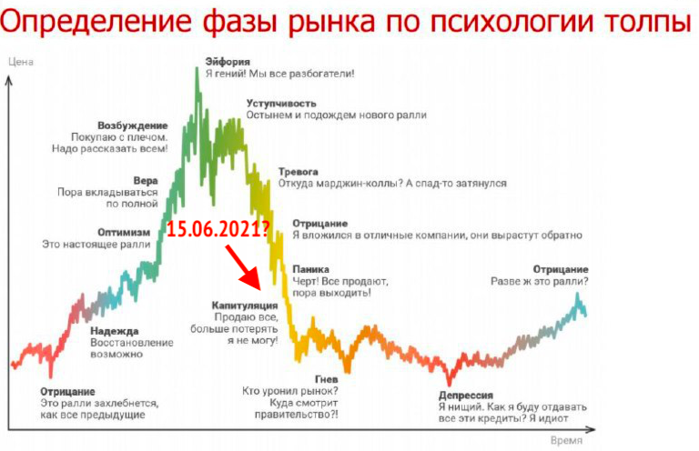 Откуда столько позитива мне непонятно, но по настроениям в тематических чатах, состояние рынка похоже на стадию "дипрессия" или "отрицание" из графика ниже. Не могу подобрать точный термин, но многие уже перестали следить за рынком, смотреть стримы(видно по просмотрам) и на текущие падение смотрят как бы со стороны.