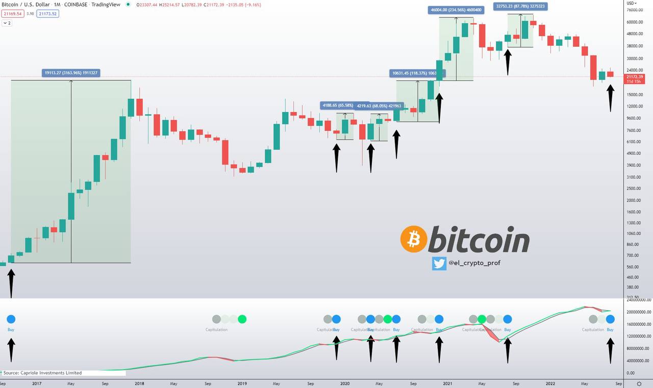 Вчера он снова подал сигнал на покупку. Каждый раз, когда это происходило, цена BTC росла как минимум на 65% (и это было как раз перед крахом Covid)