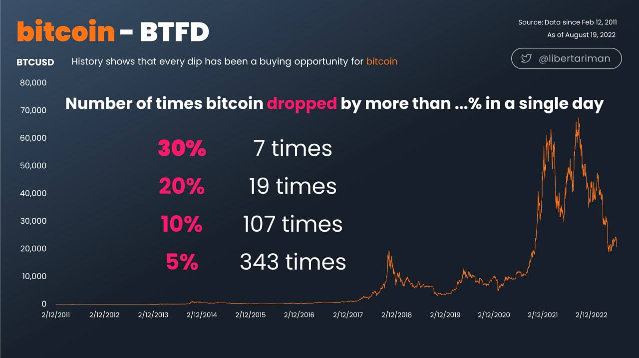 Автор намекает, что мол вчера биткоин упал на 10% 107-ой раз в истории и типа его откупали все 106 предыдущих раз. Также автор указал 343 падений на 5%, 19 на -20% и 7 на -30%. Естественно, автор показывает что надо покупать(неизвестно с какой целью). По моим ощущениям, 19 раз на -20% было только за последние два года, но возможно это иллюзия.