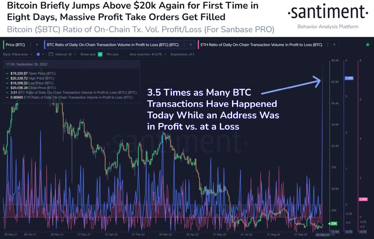 Утром вышли данные от аналитического агенства Santiment с намеком на то, что как только цена биткоина превысила 20 000$, объемы торгов резко возросли в 3.5 раза. При этом в продажах участвовали как адреса находящиеся в прибыли, так и в убытках(изображение). На самом деле выглядит не так уж и убедительно, но тут включился конкурент: