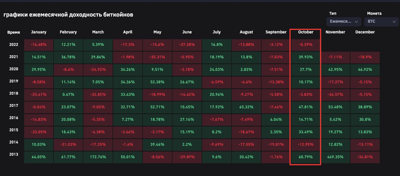 Мы часто слышали про то что сентябрь исторически плохой месяц для крипты и даже для акций, но он прошел и наступает самый исторически удачный месяц для биткоина - октябрь