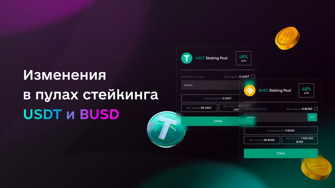 - Возможность стейкать стейблкоины BUSD и USDT под 48%