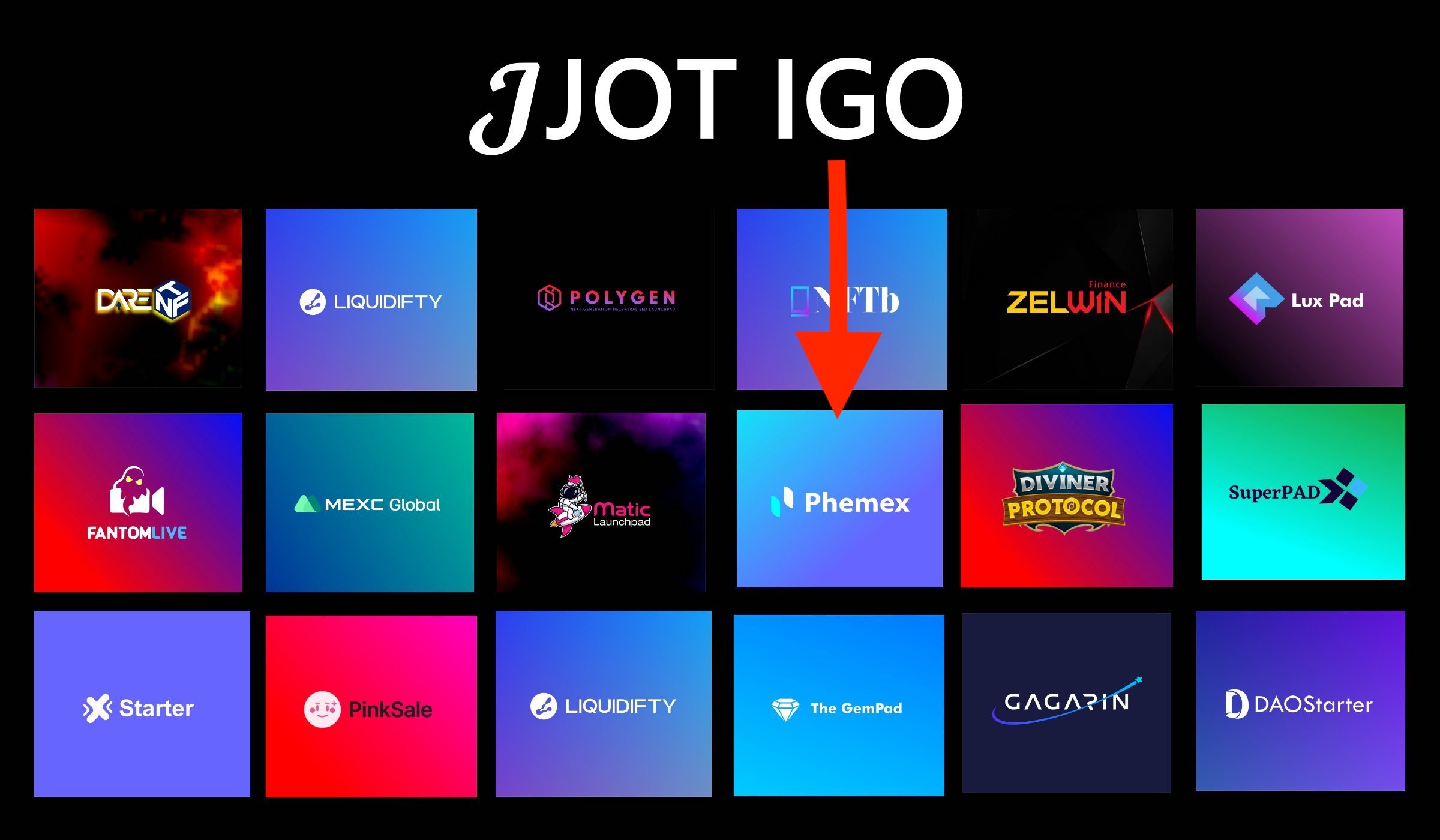 У проекта достаточно активный твиттер, довольно крупная и активная телега и что важно, будет активная серия IGO на ряде площадок(на изображении). И судя по тому, что некоторые площадки из этого перечня начали публиковать информацию о предстоящем JOT IGO, листинг будет довольно скоро