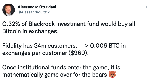 Всего лишь 0.32% от инвестиционного фонда BlackRock хватит, чтобы купить все запасы BTC на биржах.