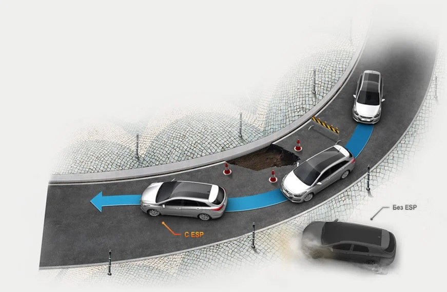 Эта система предотвращает скольжение и срыв автомобиля в занос. Она работает совместно с ABS и определяет положение передних колес, сравнивая эту информацию с направлением движения машины. Если она считает, что водитель начинает терять контроль над автомобилем, то притормаживает колеса и уменьшает крутящий момент, выравнивая траекторию движения машины.
