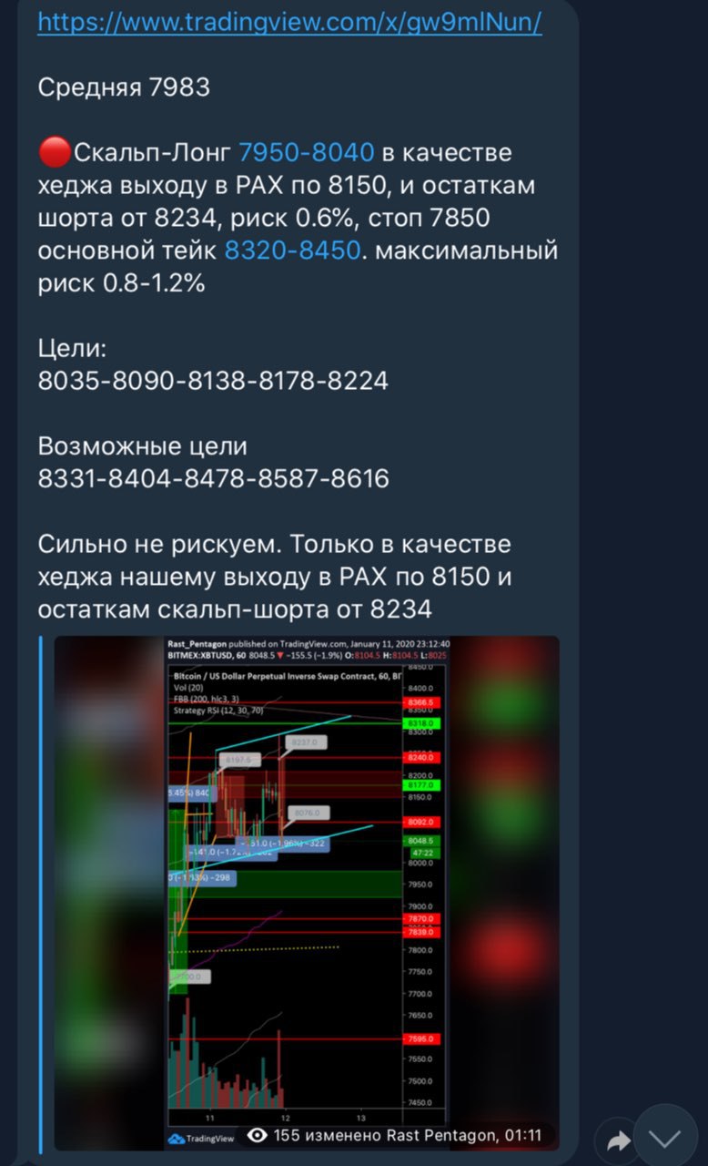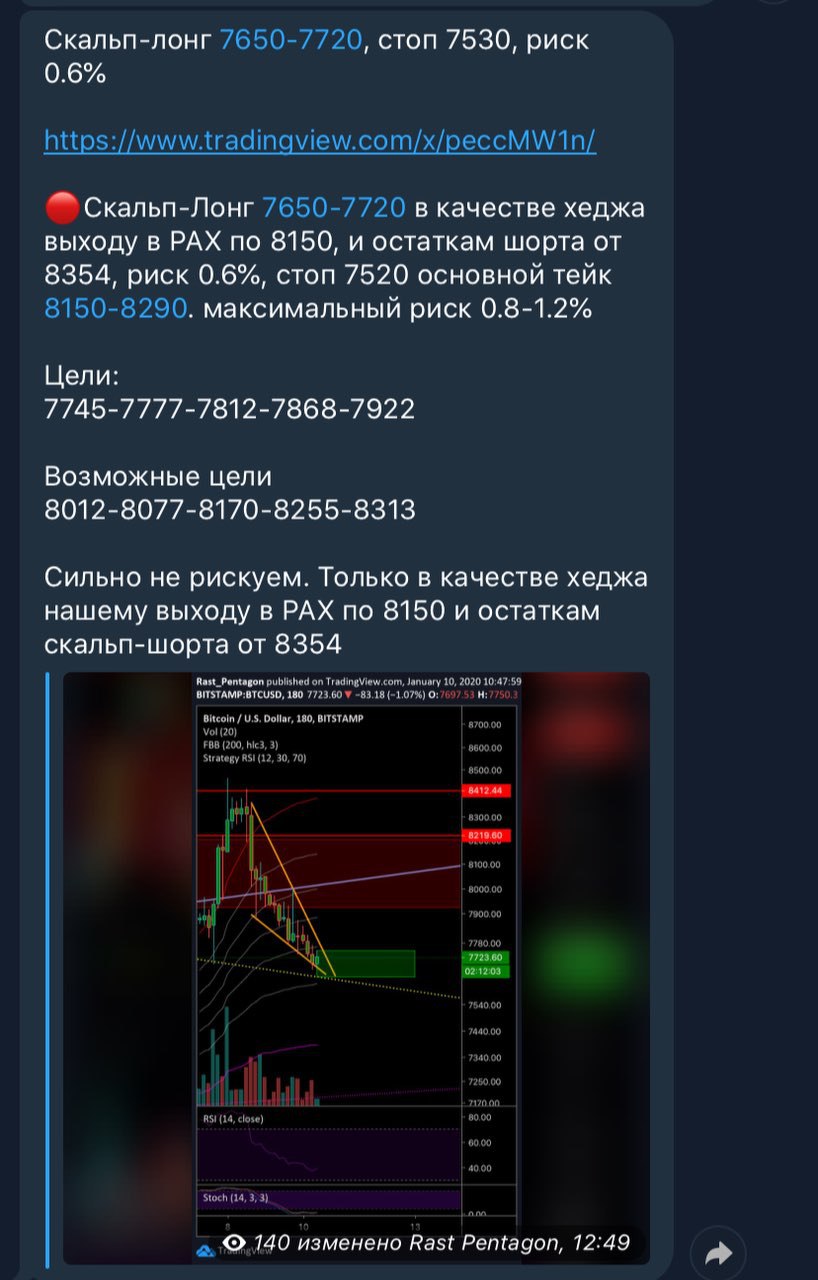 В качестве хедж-позиции нашему открытому шорту от 8354, мной и бойцами был взят скальп-лонг в диапазоне 7650-7730. Моя средняя 7700. Я закрыл 70% на тейке 7922 и остаток висит в прибыльном БУ , а это больше 220 пунктов профита! Остальные тейки на скрине!…