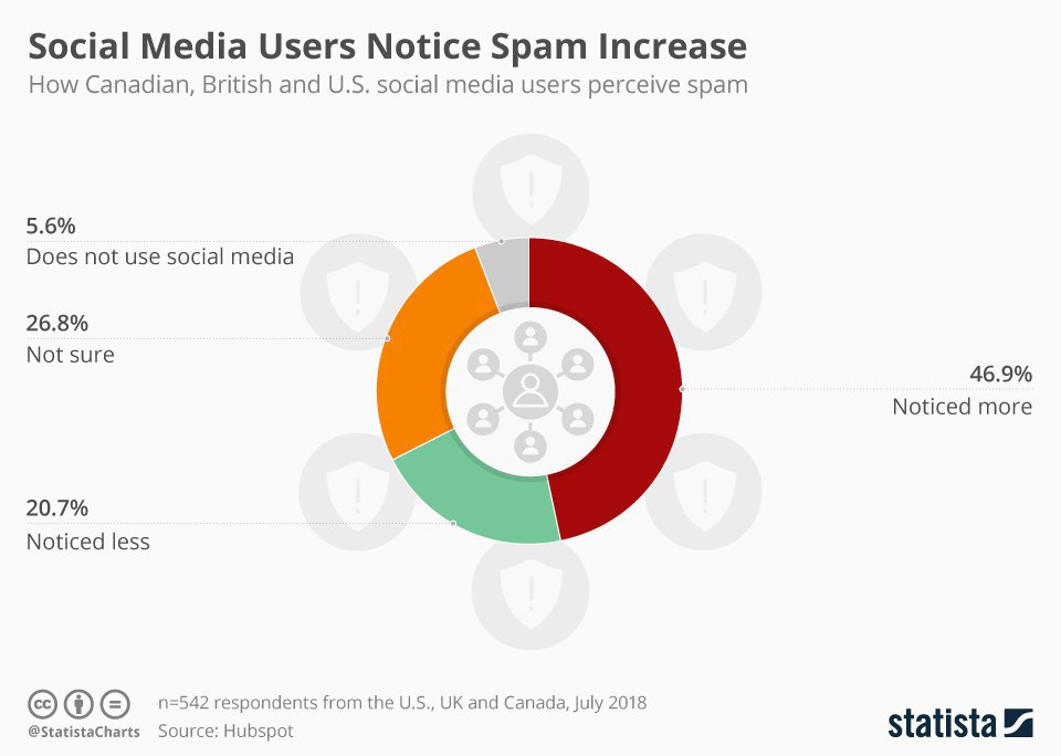 Even though #Facebook & #Twitter recently introduced steps to keep their platforms clean, 47% of respondents of a survey conducted by Hubspot perceived their social media feeds to be more spam-loaded in recent months.