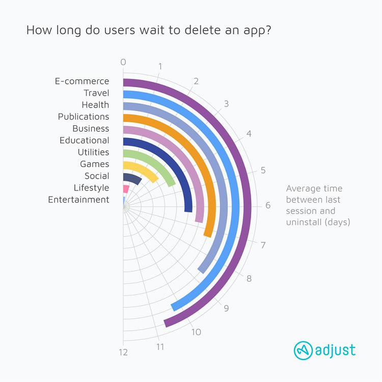 From an analysis of over eight billion installs, across acquisition types, platforms, and verticals, Adjust found that marketers have less than six days (after the last app open) to re-engage users before they uninstall.