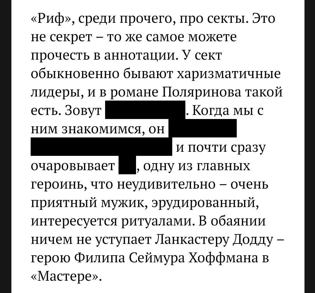 На «Дистопии» вышел офигенный текст под названием «Из чего сделан „Риф“». Микаэль Дессе рассказывает о романе через фильмы о сектах — от «Мастера» до «Солнцестояния».