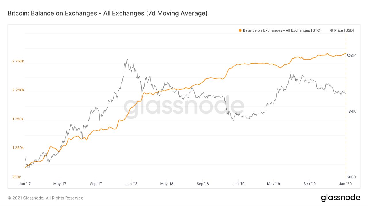 По данным того же Glassnode, количество битка на биржах с начала 2017 года по начало 2020 года выросло примерно с 1 000 000 BTC до 2 900 000 BTC. Судя по графику (скрин ниже) никакой корреляции ни с какими балансами никогда не было и даже наоборот. В 2017 мы росли вместе с количеством битка на биржах.