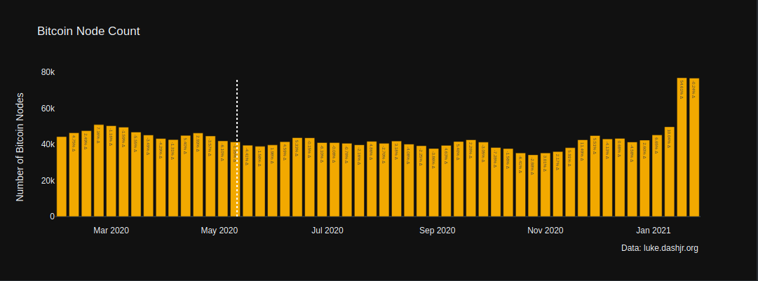 Неделю назад - 17 января,сервисом bitcoinkpis.com замечено резкое увеличение количества полных нод биткоина. Сервис считает количество нод целиком, не как большинство других.