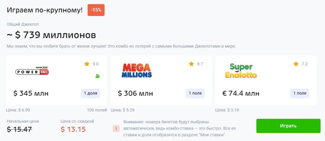 Потрясающая комбинация трех лотерей и суммарный джекпот в 934 миллиона американских долларов со скидкой стоимости ставки в 15%!
