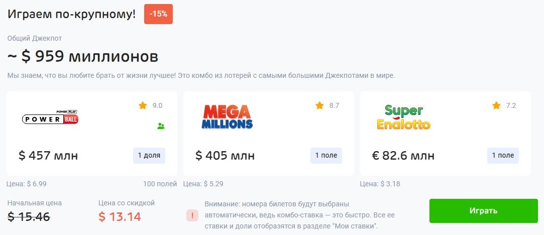 💥 Всего 13 долларов США за 112 комбинаций, чтобы испытать удачу в суммарном джекпоте 959 миллионов долларов!