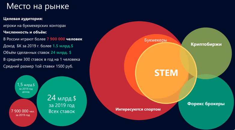 STEM планирует отобрать 20%(вполне реальная цифра) аудитории у СНГ букмекеров, Таким образом, если сбудется все задуманное то клиентами биржи станут по меньшей мере 1.5 млн человек(при том что рынок ставок растет в среднем на 15% в год). И это только аудитория, которая прийдет после запуска биржи(2022 год).