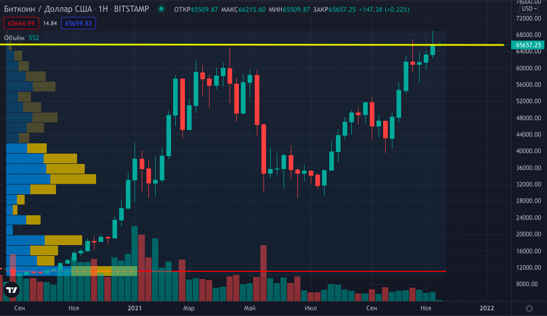 Так или иначе, коррекция произошла, но это не помешало Биткоину закрыться рекордно высокой недельной свечой. Это хороший знак, при том, что на графике BTC уже "отыграл" половину последнего падения.