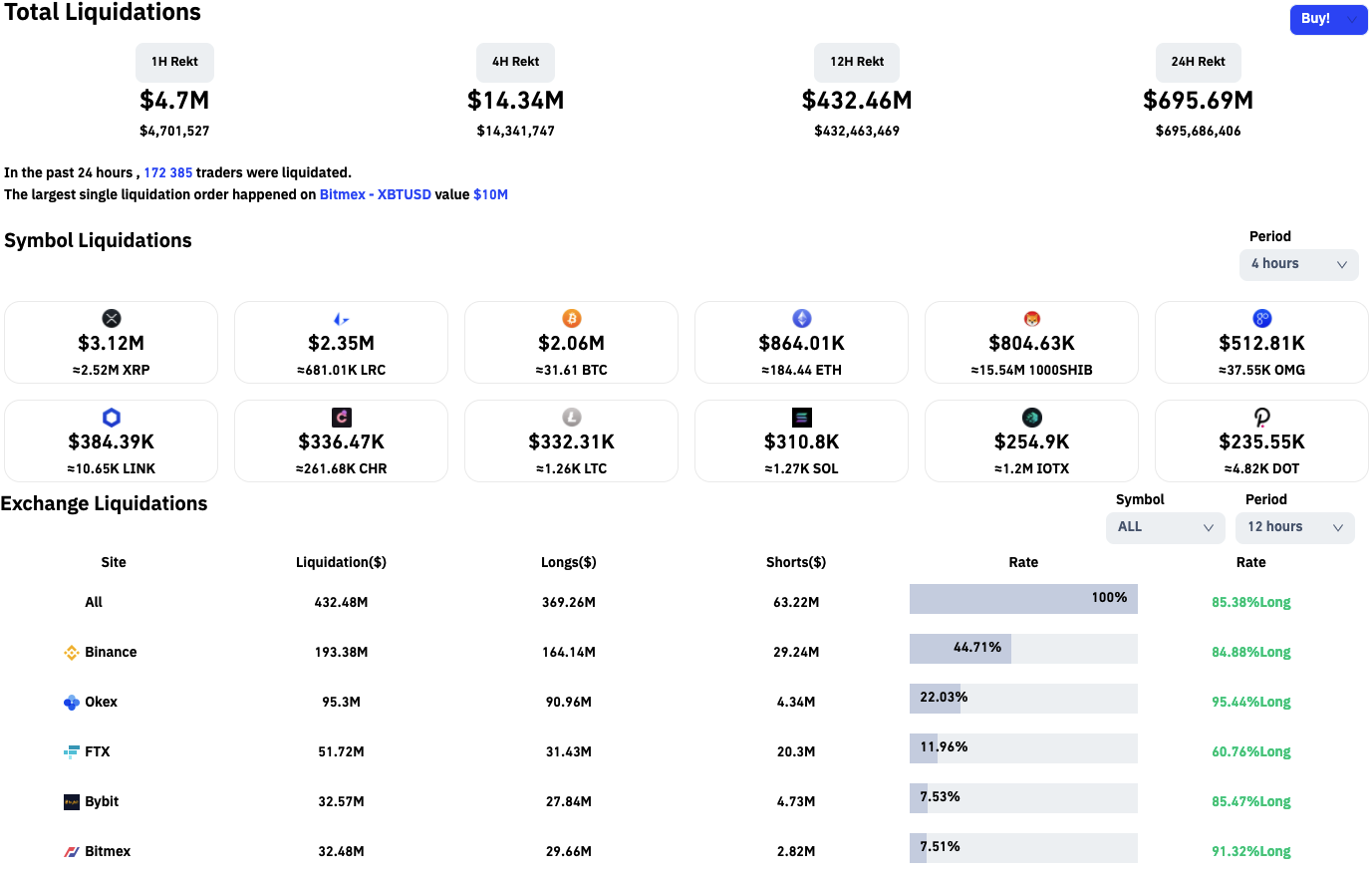 Так или иначе, "лонг-сквиз" на биткоине и множестве остальных криптовалют произошел и сумма всех ликвидаций составила без малого 700 млн $. Из которых 85% лонгов, а это почти 600 млн $ или 150000 ликвидированных трейдеров. Да, не так много, как например в мае(2 млрд $), но и рынок не упал на 50%, но этого движения было достаточно, что бы капитализация рынка снова стала меньше 3 трлн $.