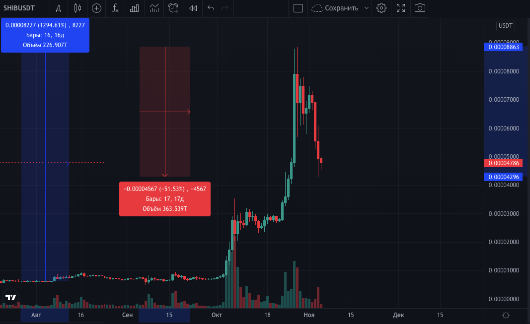В итоге, произошло то, что должно было произойти: новостями о супердоходности Shiba Inu и её мега капитализации(40 млдр$), некто смог привлечь новые деньги. И эти деньги, за которые покупалась монета проекта, оплачивались продажи старых добрых китов, героев красивых сказок о миллионах процентов прибыли.