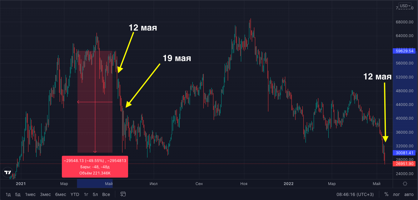 За последние сутки биткоин дал -15%, и что символично, ровно год назад, 12 мая, начался крупнейший обвал цикла. В тот день цена также просела на 15%, а далее, 19 мая, произошло то, что принято называть "черной средой", день, а точнее, 2 часа, за которые биткоин упал на 32%, большинство альткоинов на 80%+, а сумма ликвидаций в тот день составила более 8 млрд $.