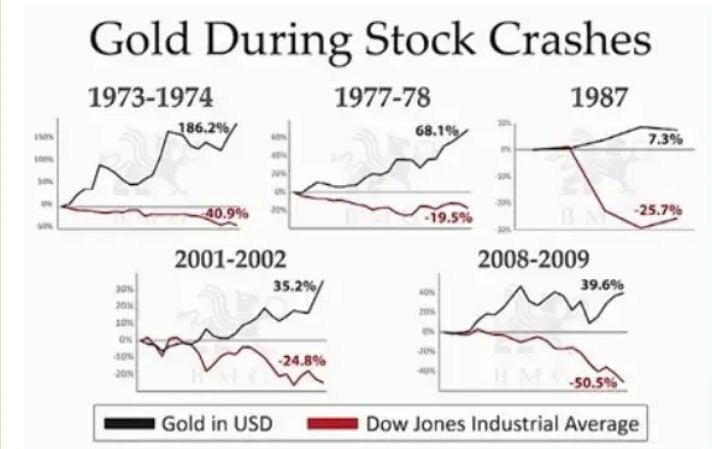 Золото отрицательно коррелирует с рынком. Это и объясняет почему за последние 10 лет доходность инвестиции в него отрицательная. Следовательно, когда на рынке спад, цена на драгметалл идёт вверх. Ниже на изображении, будет наглядная картина того, как вела себя цена на золото, в пяти последних кризисах, с 1973 года. Это хорошо объясняет как работает обратная корреляция золота к рынкам.