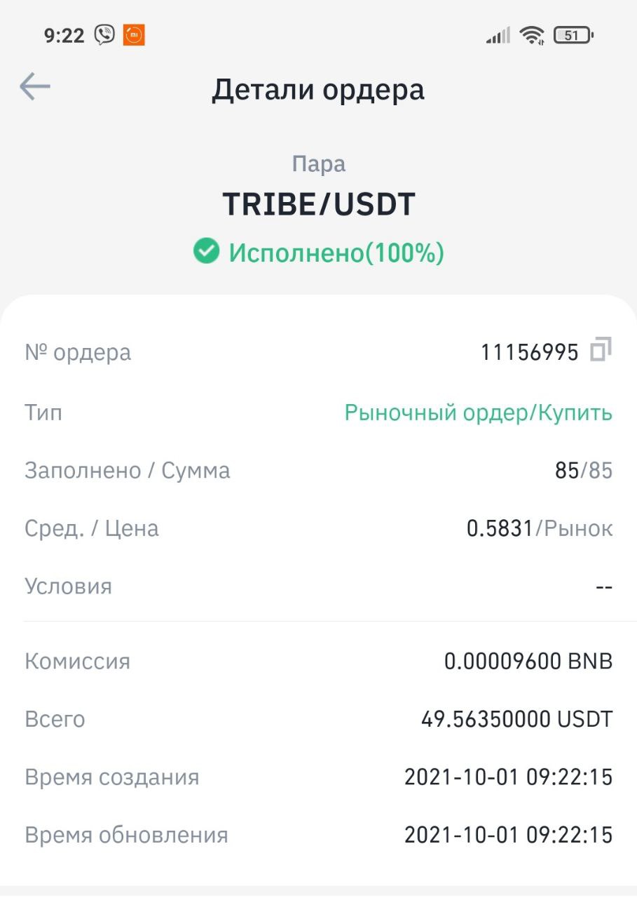 Покупаем в наш основной портфель монету TRIBE. Есть практически на всех больших биржах, мы брали на Binance.