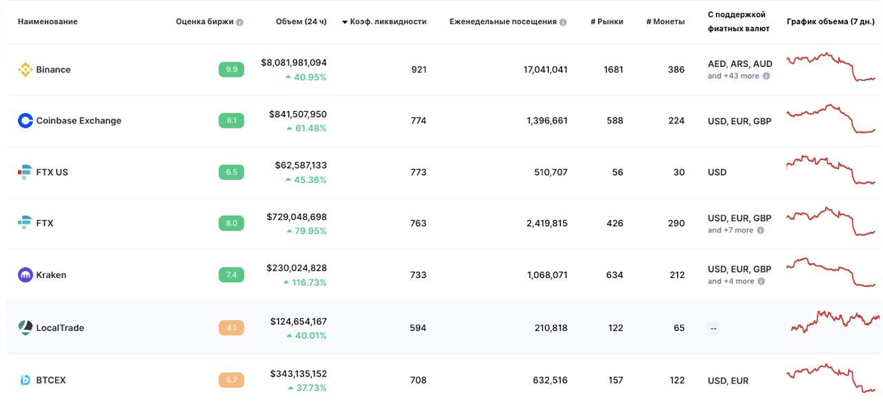 Также стоит обращать внимание на такой показатель как коэффициент ликвидности, который формируется из топ-25 торговых пар, без учета стейблкоинов. По этому показателю все тот же LocalTrade в топ-20 бирж мира и значительно выше таких распиареных брендов таких как OKX, Gate, KuCoin, Huobi Global, WhiteBIT, Currency, МЕХС и даже родной для Артура Хейса BitMEX.