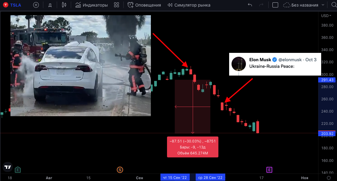 🕊Уверен, все уже слышали про то как в первых числах октября Tesla вышла с очередным убыточным отчетом(в этом году), а Маск поднял непопулярную тему прекращения войны в своем 100 миллионом твиттере. Совершенно ясно, хотел Илон того или нет, но фокус с акций Теслы он сбил, а его твиты начали называть причиной падения акций, но тогда цена упала всего на 5%(по некоторым данным на 8%, а падение продолжается уже на 50% от хаев и на 30% за месяц.