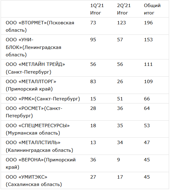 Абсолютным лидером экспортеров являются Санкт-Петербург и Ленинградская область. В отличие от 2020 года в первом полугодии 2021 г. вперед вырвался Псковвтормет. Близки по объемам отгрузки Уни-Блок пока что на втором месте.