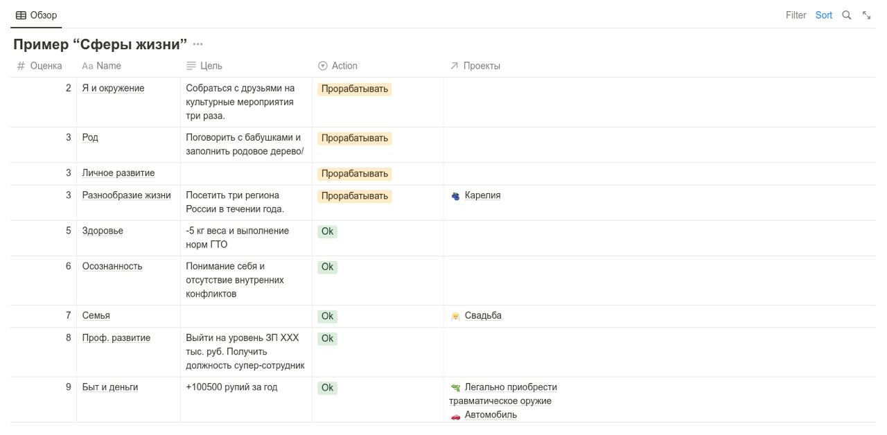 Менеджер развития продуктов Артем Плетнёв поделился необычным способом выстраивания системы управления временем в Notion — он сгруппировал свои проекты в «Сферы жизни» — 9 направлений, которые он постоянно держит в фокусе и в которых старается развиваться. Например: