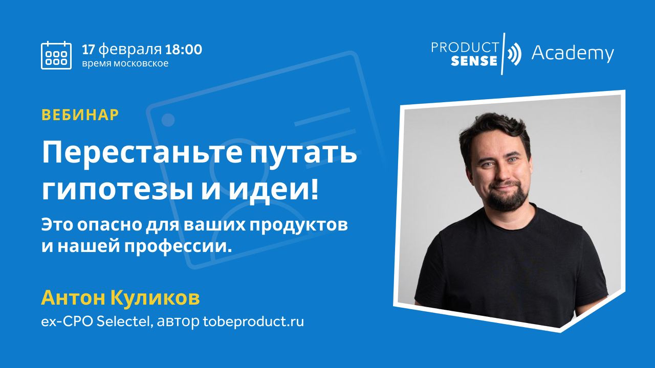 📅 17 февраля, в 18:00 МСК — вебинар о том, как научиться разделять продуктовые идеи и гипотезы. Эксперт — Антон Куликов, ex-CPO Selectel, автор tobeproduct.ru.