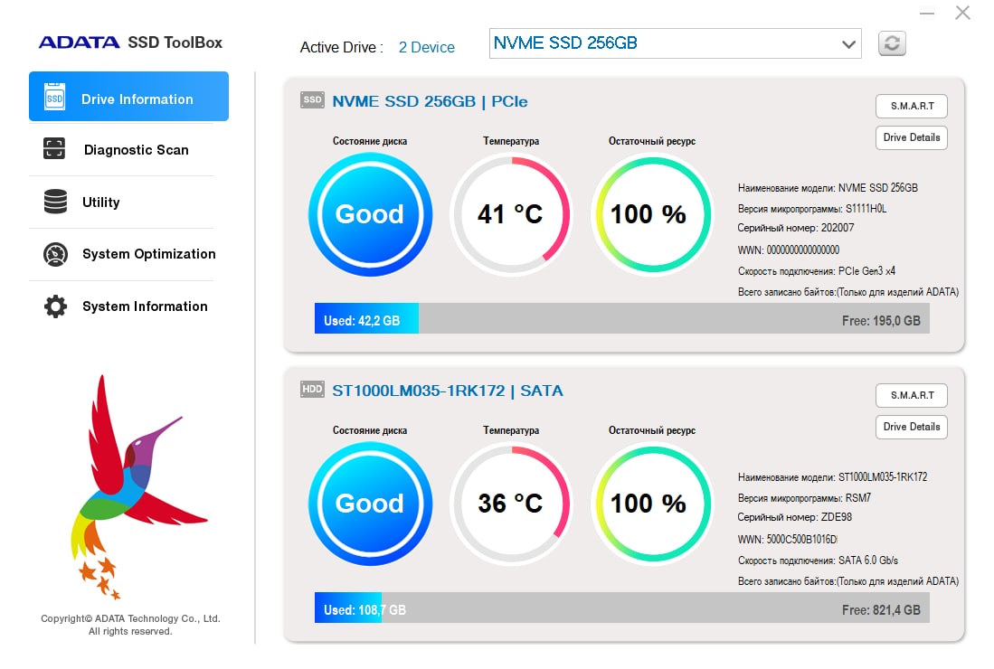 ADATA SSD ToolBox - программа для работы с SSD дисками, вы сможете получить от них максимально полную информацию, у вас будут инструменты для обновления прошивки на более новую, получите возможность не только стирать но и отслеживать общее состояние вашего накопителя, всё это может данная программа сделать за считанные секунды.