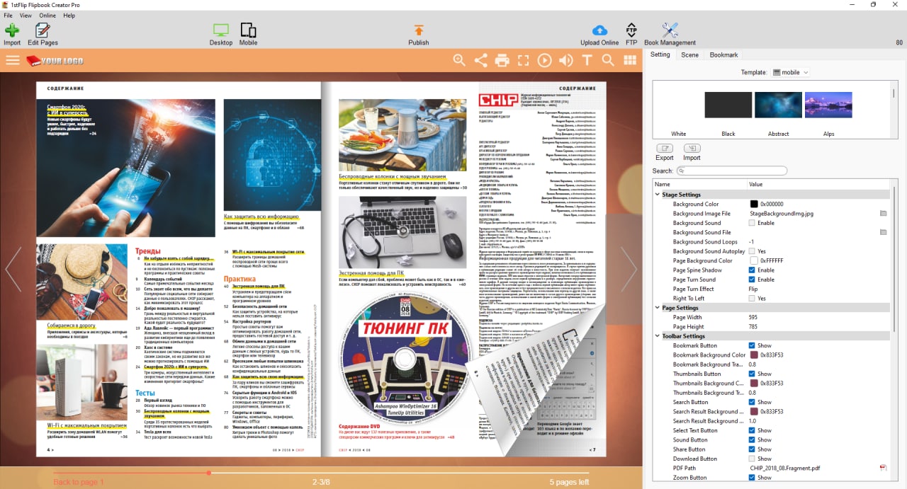 FlipBook Creator Pro - позволит вам конвертировать документы формата PDF в flash или HTML5 флипбук, то есть вы можете читать книгу или журнал с эффектов перелистывания страниц, с музыкальными эффектами, роликами и прочими плюшками. Есть возможность добавить видео с разных источников, YouTube или Vimeo допустим, есть локальная поддержка, дополнить книгу можно ссылками, кнопками, своими заметками, все сохраняем и после читаем.