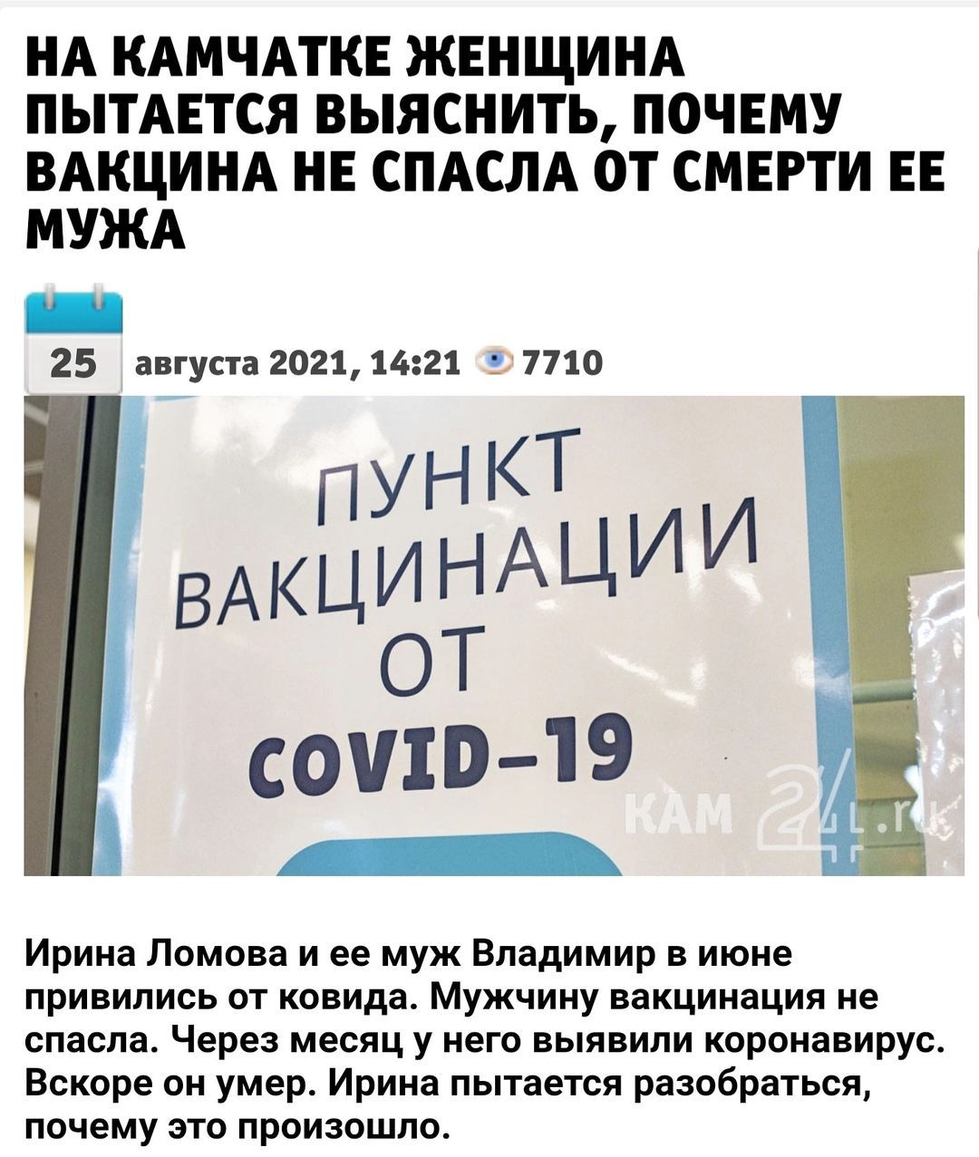 grudinin_khabarovsk_ «Мой муж умер после вакцинации препаратом ЭпиВакКорона. Здоровый 62-летний мужчина угас за несколько дней. Почему это случилось? Ведь нам говорили, что прививка нас защитит?» – задается вопросом жительница Петропавловска-Камчатского Ирина Ломова.