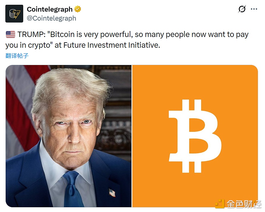 金色财经报道,特朗普在未来投资倡议峰会上表示:“比特币非常强大,现在很多人想用加密货币向你付款。”