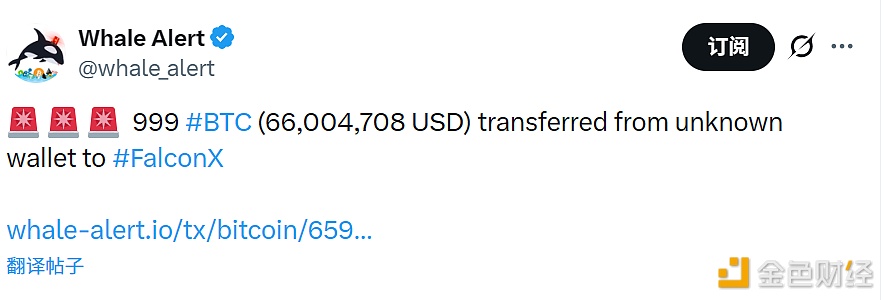 金色财经报道,据Whale Alert监测,999枚比特币(价值66,004,708美元)从一个未知钱包转移至FalconX。
