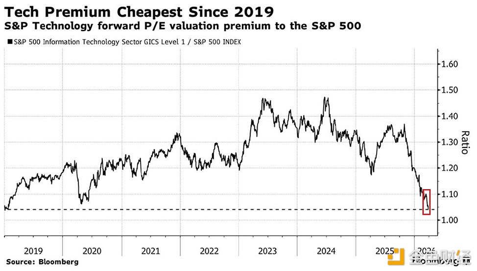 金色财经报道,3 月 29 日,The Kobeissi Letter 发布市场分析,美国科技股已进入相对低估区间,标普 500 信息技术指数目前的远期市盈率(P/E)仅较标普 500 指数高出 4% 溢价,这是自 2019 年 1 月以来的最低水平,该溢价自 2025 年 10 月以来已下跌 32 个百分点,创下有记录以来最大折扣之一。