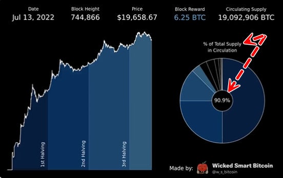 👀 В то время. когда инфляция в США достигла 9,1%, в сети биткоина осталось добыть 9,1% монет от максимально возможной эмиссии в 21 млн BTC