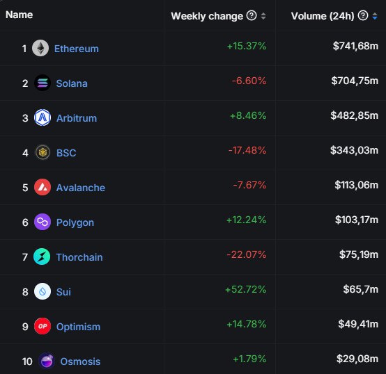 📊Solana уверенно борется с Ethereum за лидерство в рейтинге торговых объемов на децентрализованных биржах, отставая всего на $40 млн, и опережая Arbitrum и BSC (последний - в 2 раза)