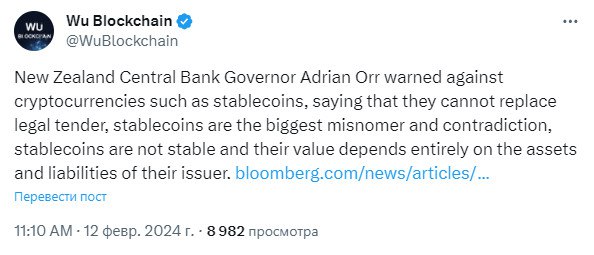 🇳🇿 Управляющий Центрального банка Новой Зеландии Адриан Орр предостерег от таких криптовалют, как стейблкоины, заявив, что они не могут заменить законное платежное средство. По его словам, стейблкоины являются самым большим заблуждением и противоречием, они не стабильны, а их стоимость полностью зависит от активов и обязательств их эмитента.