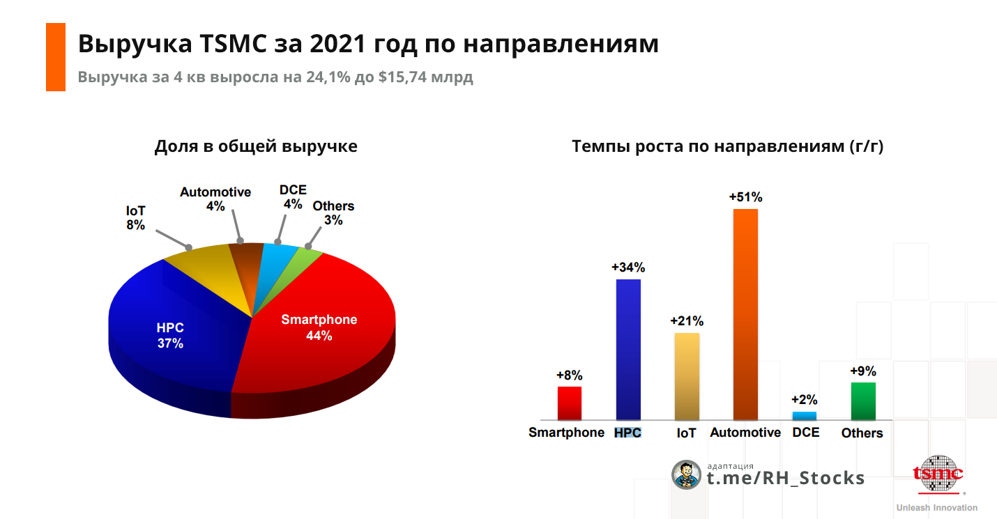 На инфографике Выручка TSMC за 2021 по направлениям (слайд из отчёта компании). Обратите внимание на 2 направления: