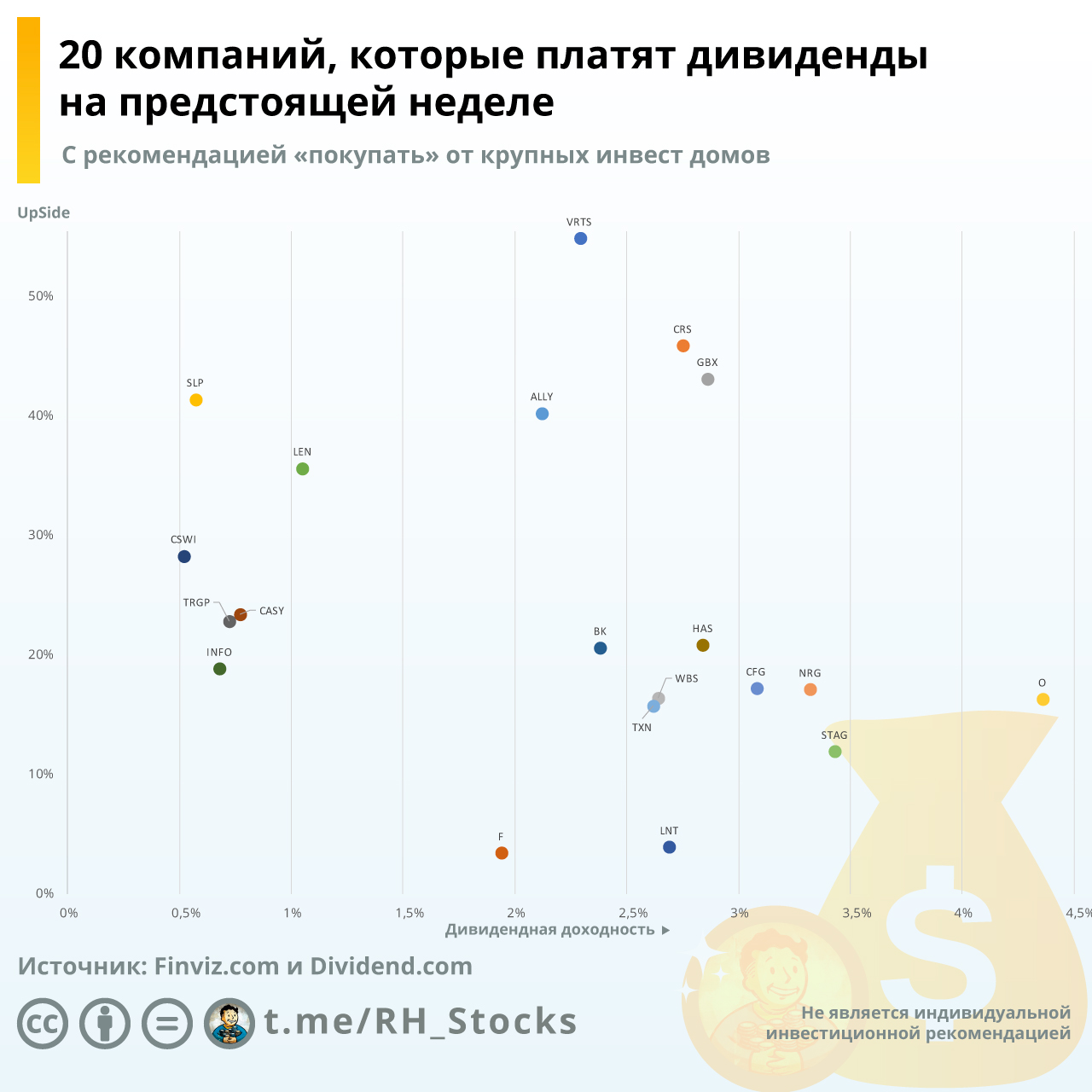 На Инфографике 20 компаний у которых на предстоящей неделе Эксдивидендная дата (последний день покупки, дающий право на получение дивидендов) и по которым есть рекомендация «покупать» от крупных инвест домов