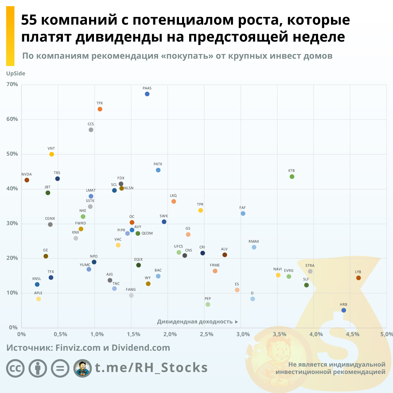 Для тех, кто не готов инвестировать в РФ (по понятным причинам) На Инфографике 55 компаний у которых на предстоящей неделе Эксдивидендная дата (последний день покупки, дающий право на получение дивидендов) и по которым есть рекомендация «покупать» от крупных инвест домов