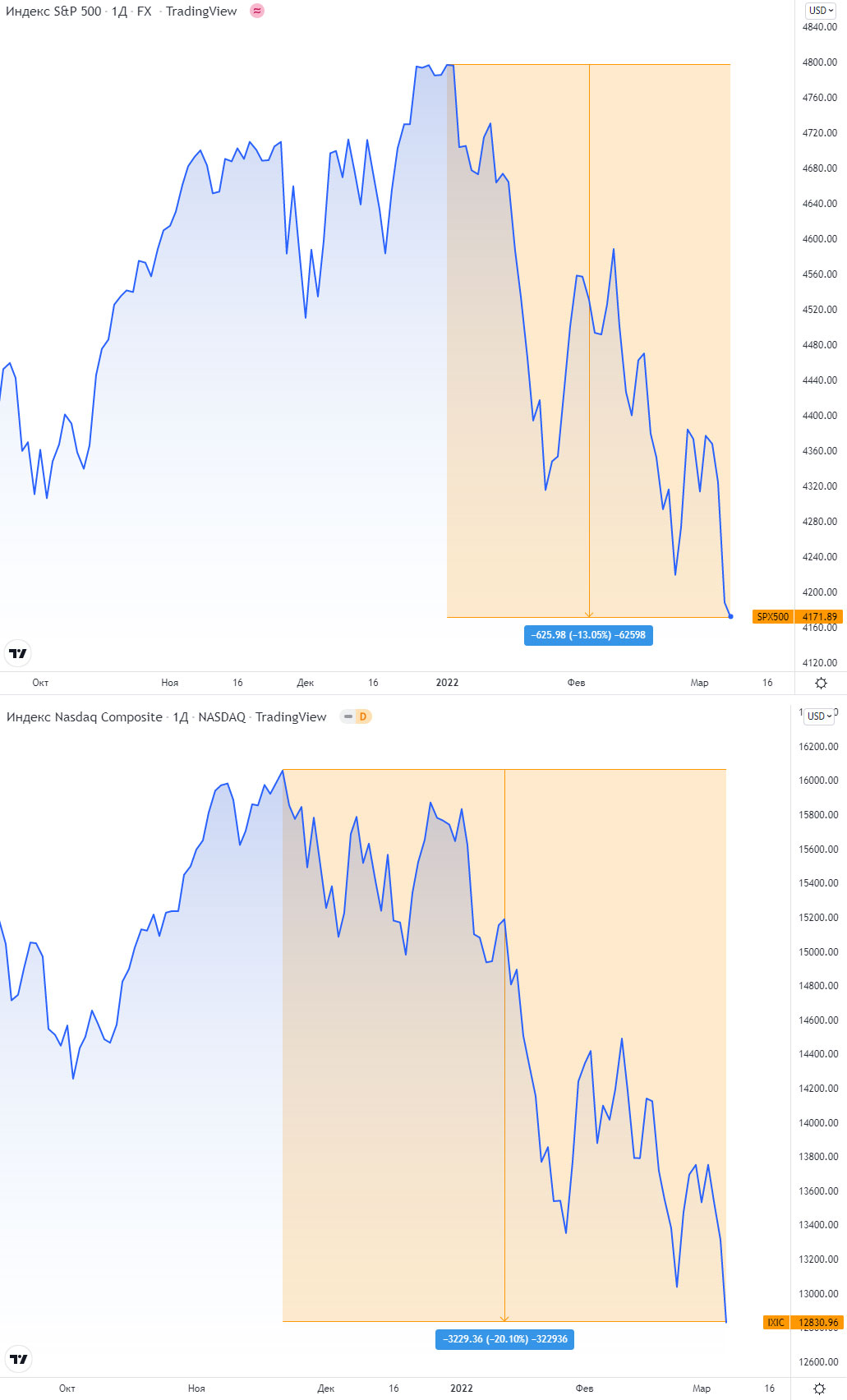 Nasdaq Composite упал на 3,6% и теперь уже перешёл от просто коррекции к медвежьему рынку, так как падение составило более 20% с рекордов Ноября