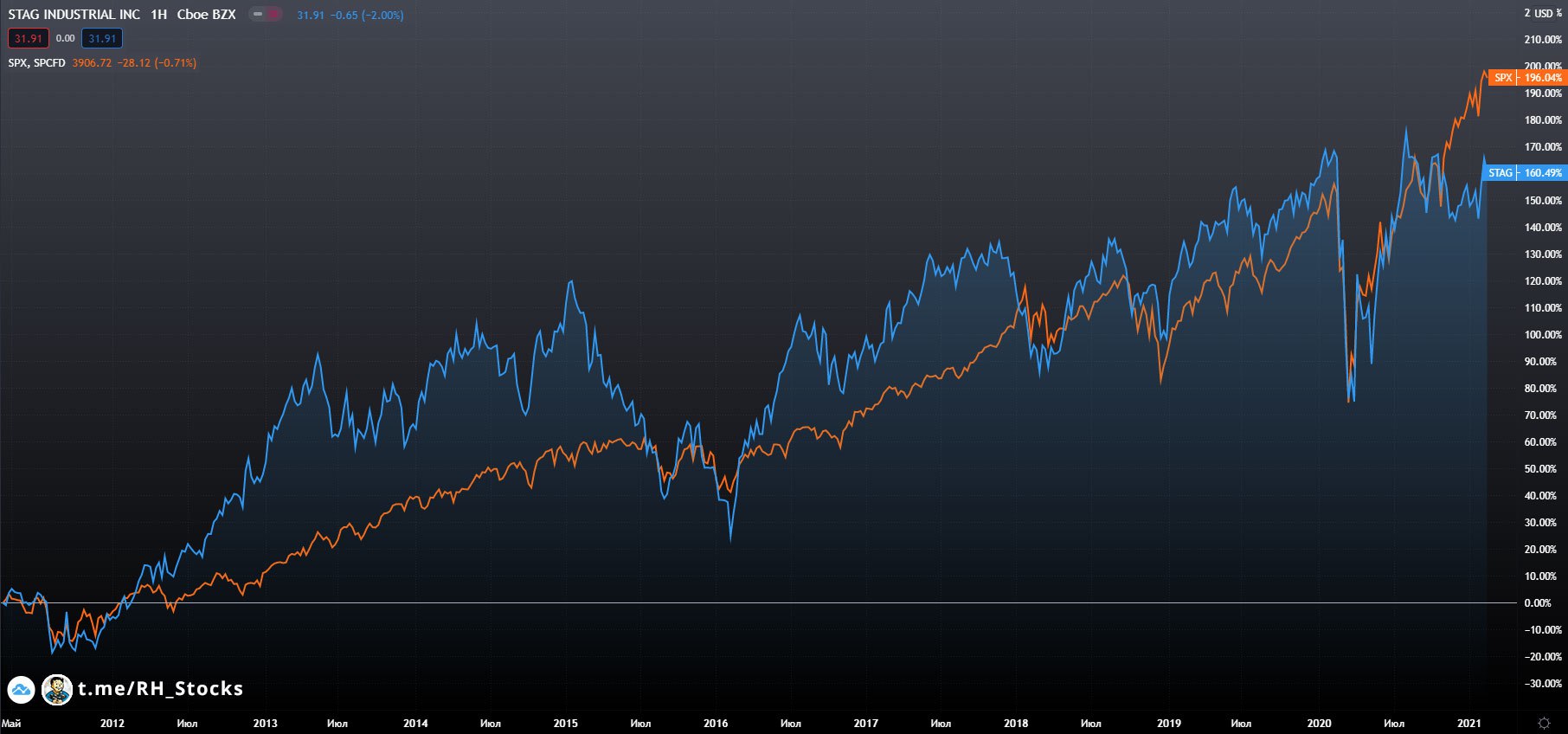 Капитализация STAG Industrial относительно небольшая «всего» $5 млрд. Любители Дивидендов могут быстро поднять стоимость акций с такой небольшой капитализацией. Один из вариантов когда стимулы для экономики свернут, многие инвесторы захотят переложиться из акций роста, в акции стоимости, но будет ли это ближайшее время, большой вопрос. В любом случае на графике видно, что компания растёт +/- как эталонный индекс SP500
