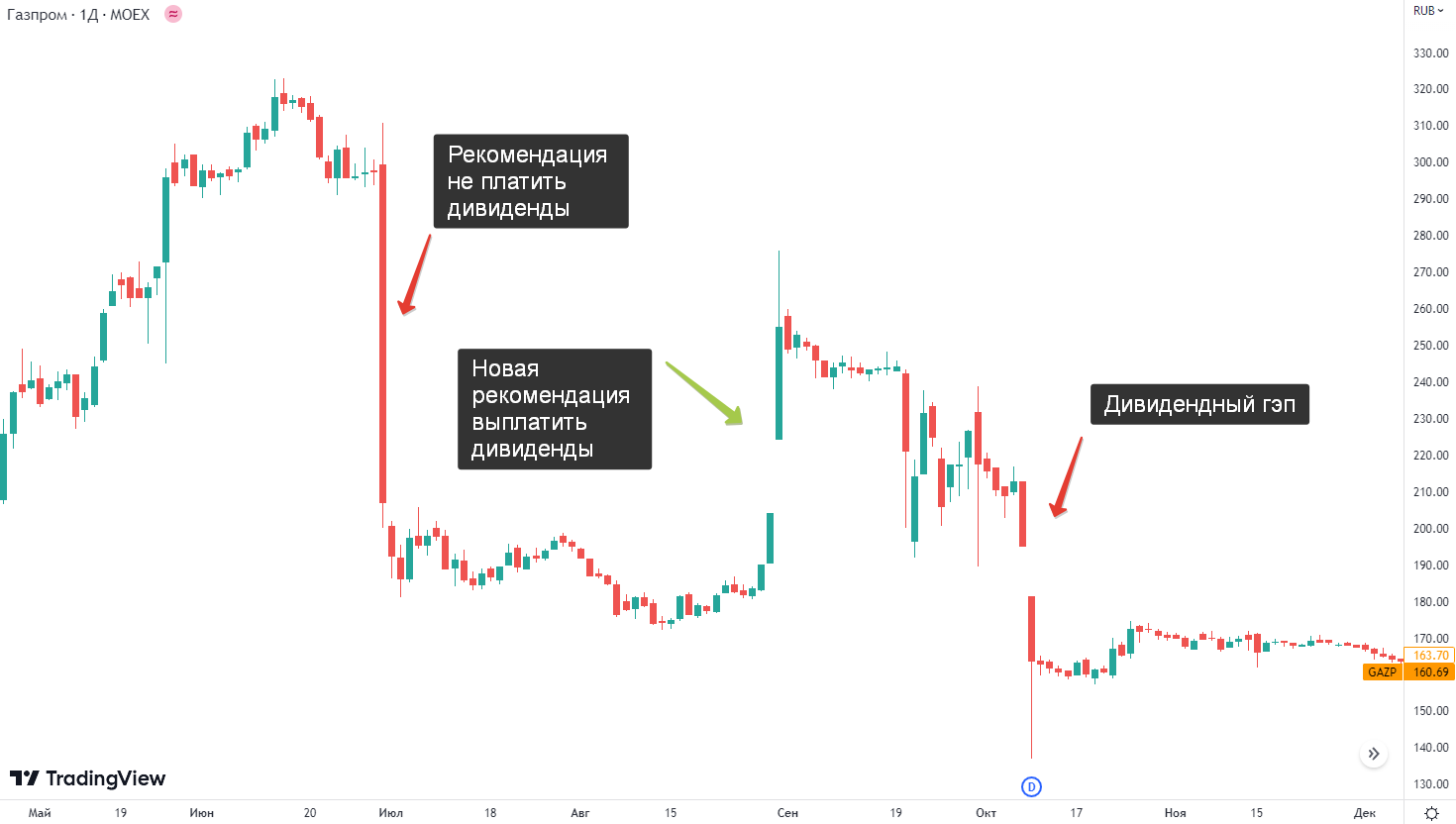 ▪️ Экс-дивидендная дата. В нашем примере это будет 14 Марта. Т.е. первый день когда держать акции для получения дивидендов уже не надо. Так как вы уже в реестре и получите дивиденды в любом случае. В этот день, как правило, происходит Дивидендный Гэп - падение цены акций на сумму примерно равной дивидендам, иногда гэп больше дивидендов, иногда меньше. Заранее это просчитать сложно.