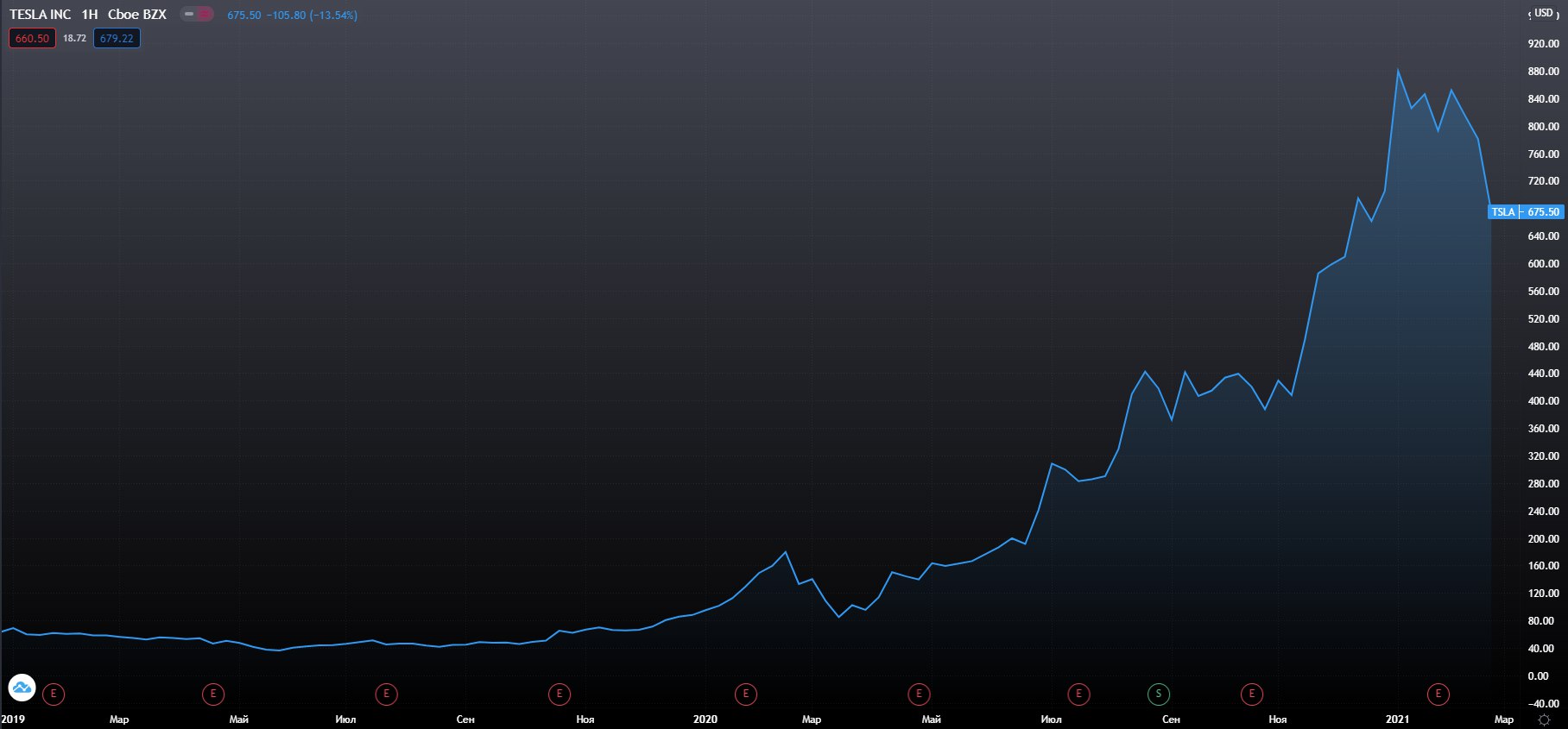 -- Акции упали на 30% по сравнению с 25 января. Падение бумаг происходит на фоне падения Биткойна, Tesla 2 недели назад объявила, что добавила $1,5 млрд в биткойнах на свой баланс. Так же давление оказывает решение прекратить прием заказов на самую дешевую версию своего электрического внедорожника Model Y.