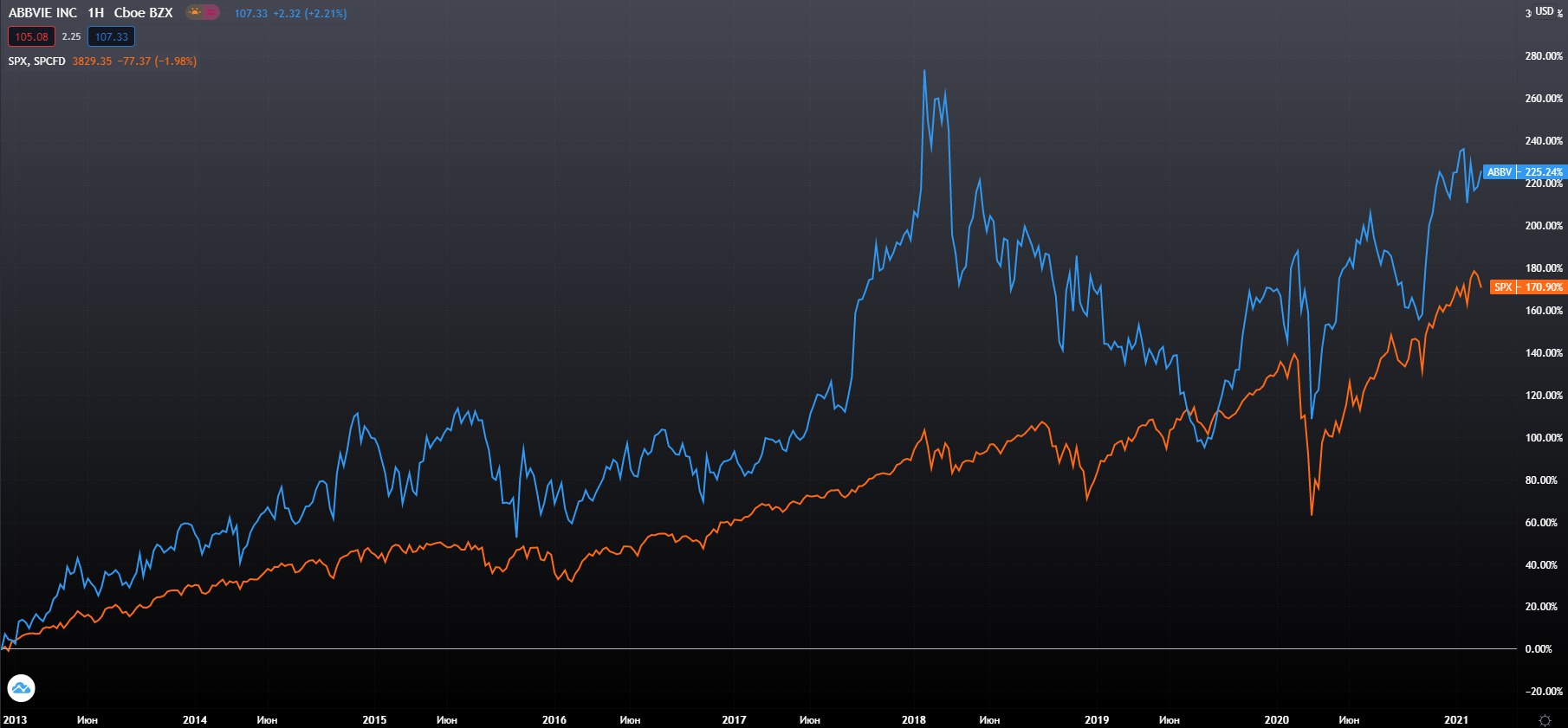 AbbVie Дивидендный Аристократ Шрёдингера. С одной стороны новая компания на рынке появилась только в 2013 году. А для получения звания Дивидендного Аристократа, необходимо минимум 25 лет подряд платить и повышать дивиденды каждый год подряд. Но так как в 2013 году она AbbVie была выделена из Abbott $ABT , а материнская компания Abbott является Дивидендным аристократом, платит и повышает дивиденды уже 49 лет, то AbbVie автоматически входит в список дивидендных аристократов. На текущий момент дивидендная доходность составляет 4,89%. И у компании впечатляющий рост дивидендной доходности.