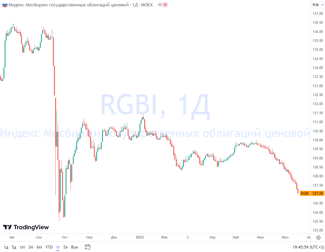 На графике индекс RGBI (Russian Government Bond), он отражает динамику изменения цены на корзину из ОФЗ с фиксированным купоном.