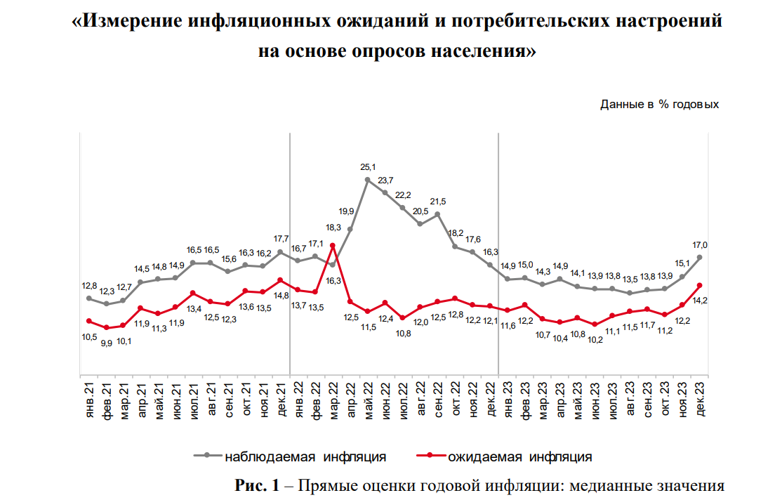 Так ожидаемая инфляция ускорилась до 14,2% (с 12,2%!). Наблюдаемая до 17% (15,1%!). Динамика потребительских цен показывает, что месячный рост цен ускорился до 1,11% в Ноябре (0,83% в октябре). Всё это ведёт к тому, что как минимум снижать ставку будут ещё не скоро, а возможно придётся ещё повысить.