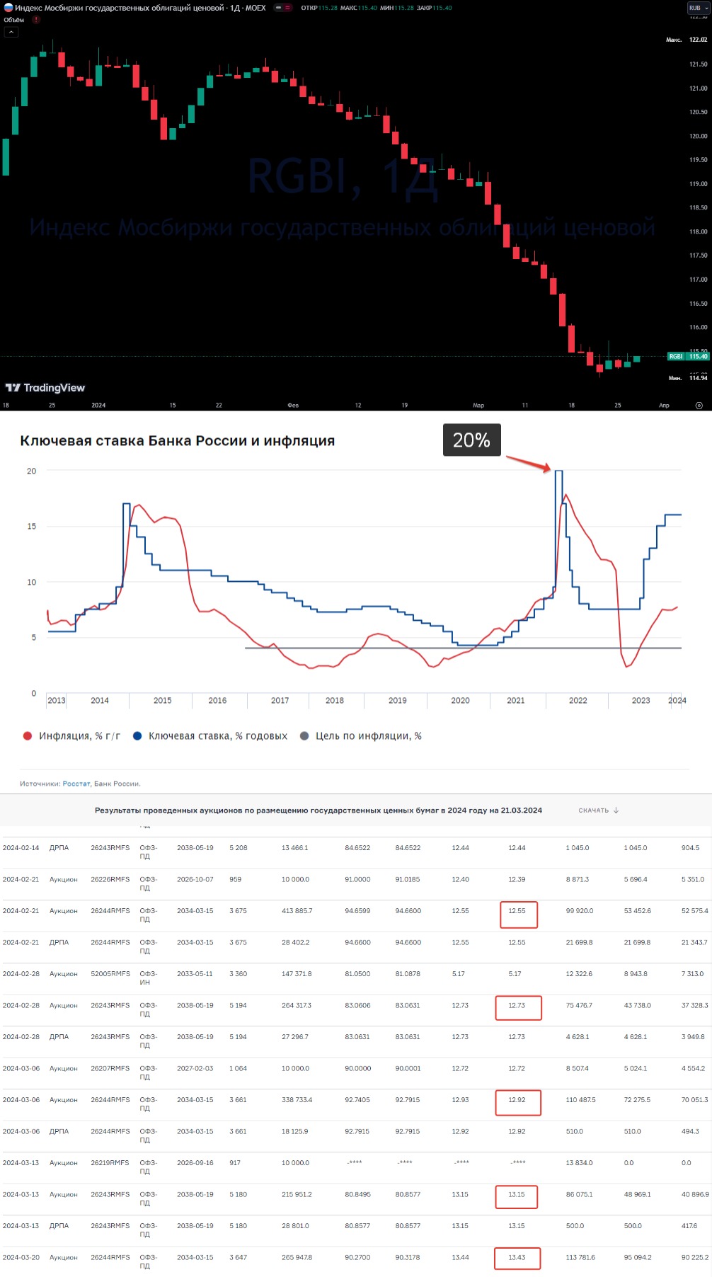 При этом мы видим замедление инфляции. Осталось теперь дождаться позитивных сигналов от ЦБ по ставке и меньших премий от Минфина на аукционах. Тогда и RGBI полегчает вообще и тело облигаций начнёт расти в частности
