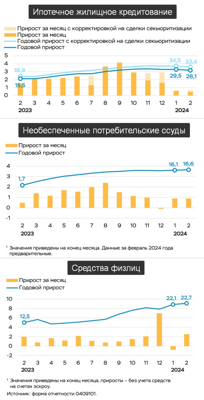 Получается, что улучшение материального положения (рост зарплат) на фоне дефицита трудовых ресурсов и крупных выплат тем кто пошёл служить по контракту позволяет с одной стороны откладывать больше денег открывая вклады под хороший процент. С другой стороны больше покупать, в том числе используя различные кредитные программы.
